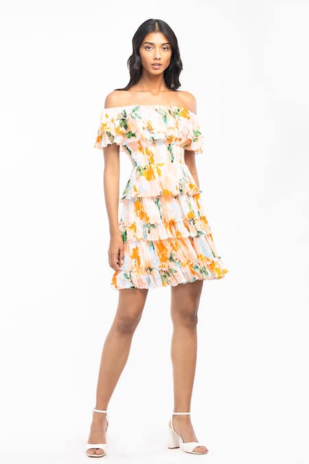 Peach Chiffon Floral Motifs One Shoulder Print Dress