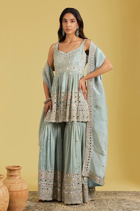 Blue Tissue Zari, Mirrors Flower Jaal Work Peplum Kurta Gharara Set