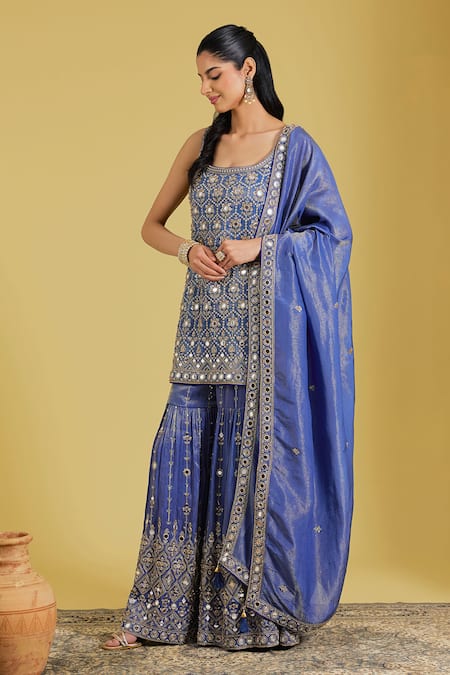 Blue Georgette Sequins, Zari, Stones Jaal And Patra Work Kurta Gharara Set