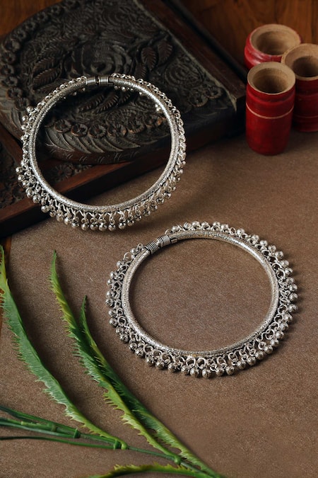 Silver Plated Gota Patti Ghunghroo Carved Round Leg Kada-Set of 2