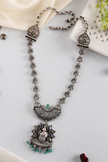 Silver Plated Gul Mor Carved Long Pendant Necklace