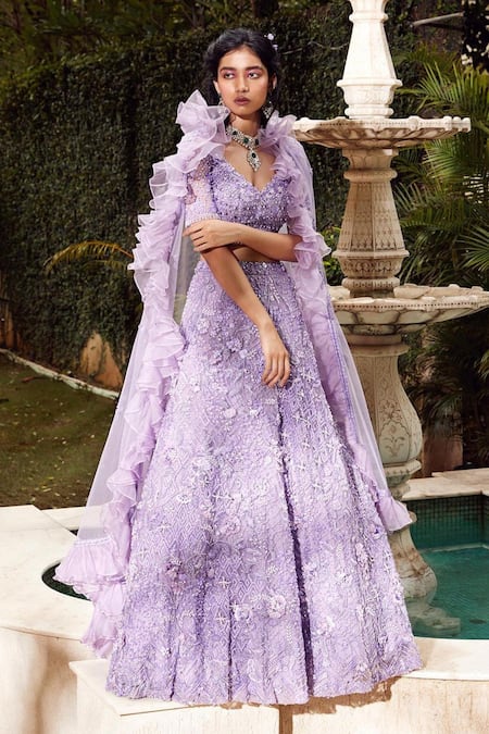 Purple Tulle Beads, Crystals, Cut Work Round Neck Athena Embroidered Lehenga Set