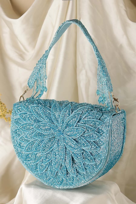 Aqua Beads, Tassels Floral Beaded Flap Bag With Detachable Handle