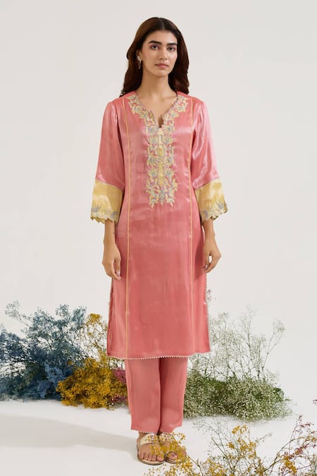 Pink Tissue Embroidery Split V-neck Placket Kurta With Pant