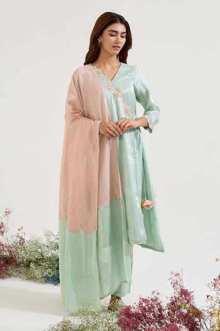 Blue Chanderi, Tissue Embroidery V-neck Straight Kurta Set