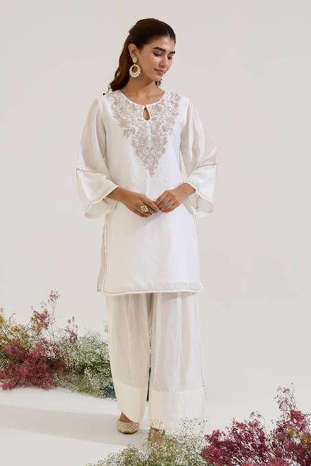 White Chanderi Embroidery Round Neck Floral Kurta With Pant