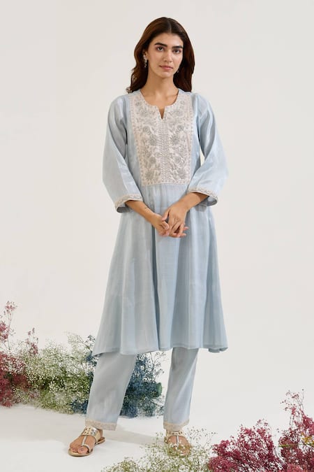 Blue Tissue Embroidery V-neck Floral Kurta With Pant