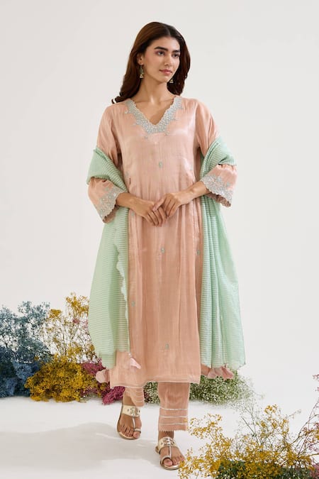 Pink Tissue, Chanderi Embroidery V-neck Placement Kurta Set