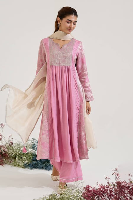 Purple Jacquard, Tissue Embroidery Split V-neck Textured Yoke Kurta Set