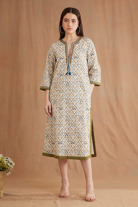 Blue Cotton Mirrors, Sequins Split V-neck Mughal Print Midi Dress