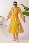 Yellow Cotton, Poplin V-neck Pomegranate Print Midi Dress