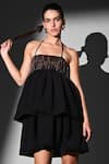 Black Embroidery Open Neck Brown Tier Dress With Threadwork