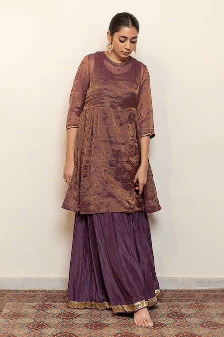 Purple Chanderi, Cotton, Silk Embroidery, Tissue Chaand Kurta With Gharara