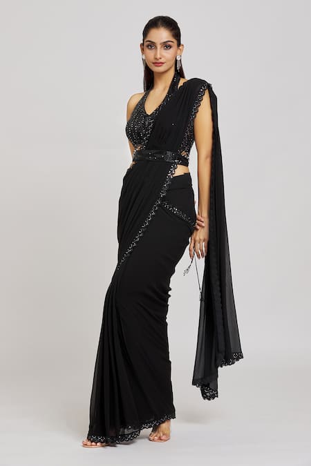 Black Silk, Net, Georgette Embroidered Border Pre-draped Saree With Blouse