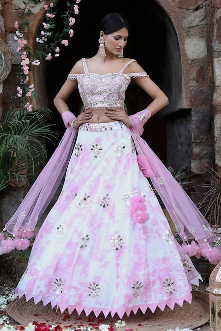 Off White Net, Silk Beads, Sequins, Mirror Embroidered Uppada Lehenga Set