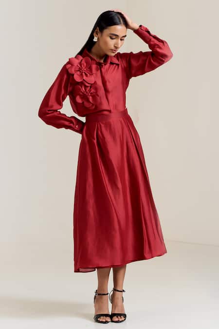 Red Chanderi Silk Fabric Flowers Collared 3d Floral Embellished Shirt With Skirt