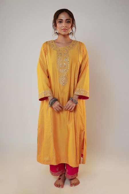 Yellow Chanderi Sequins, Zari, Embroidery Round Neck Placket Kurta And Pant Set