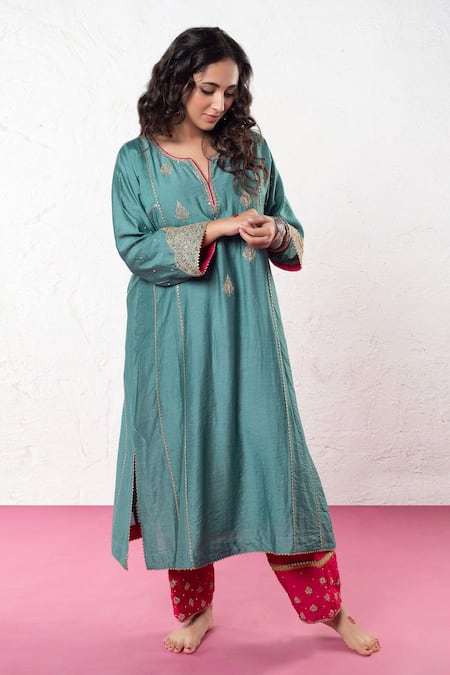Green Chanderi Zari, Sequins, Patchwork Round Neck And Applique Embroidered Kurta