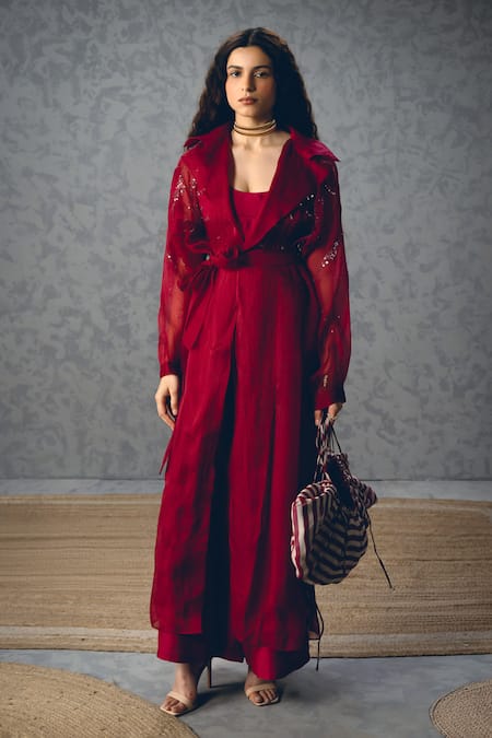 Burgundy Modal, Silk, Organza Nami Embroidered Jacket And Pant Set