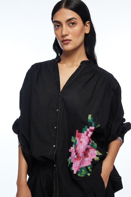 Buy_Payal Pratap_Black Handloom Cotton Embroidery Collared Floribunda Oversized Shirt _Online_at_Aza_Fashions