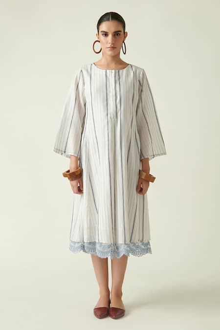 White Cotton Silk Handloom Stripes Round Winter Box Pleat Dress