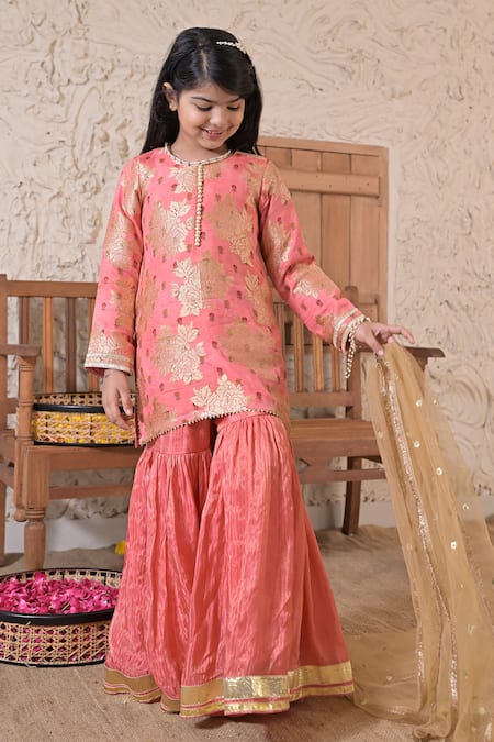 Pink Silk, Tissue, Net Embroidery, Gota Patti, Floral Pattern Kurta Sharara Set