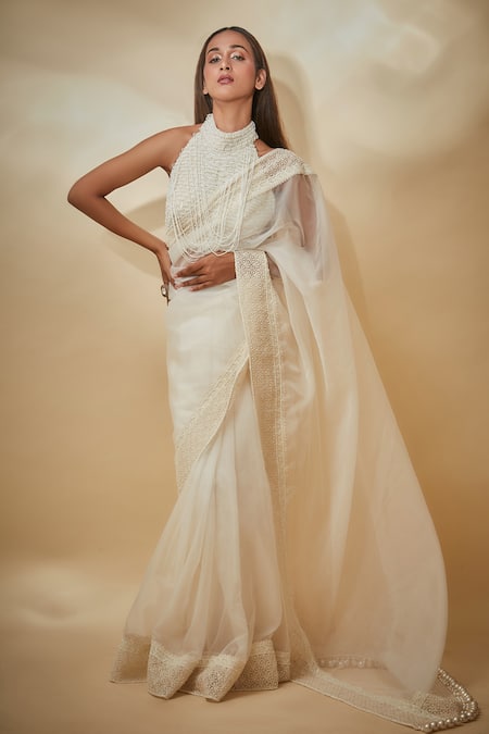 White Tulle, Viscose, Georgette Pearls, Embroidery Border Saree With Blouse