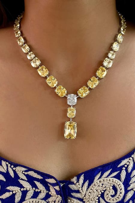 Buy_PRERTO_Yellow Smocking Citrine Square Drop Diamante Necklace Set _at_Aza_Fashions
