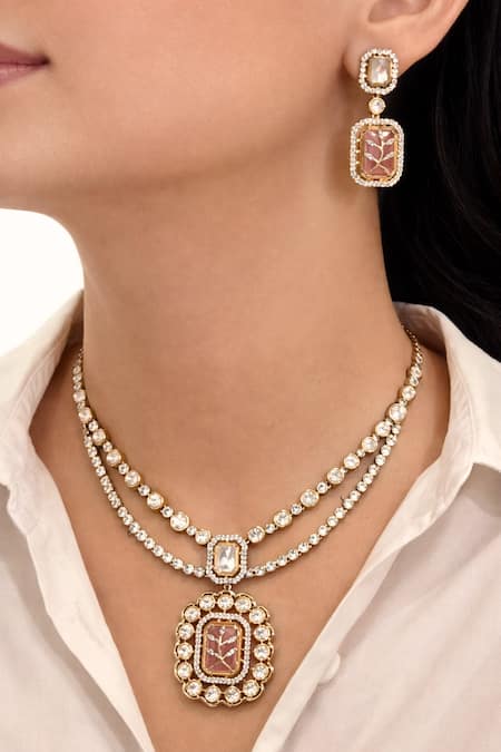Pink Stones Polki Floral Charm Pendant Necklace Set