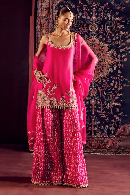 Pink Chanderi, Silk, Brocade, Organza Embroidery, Zari Kurta Sharara Set