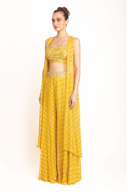 Peach Georgette Mirror, Zardozi And Sequin Work Cape Jacket Printed Palazzo Set