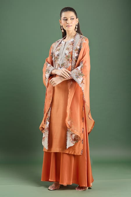 Orange Embroidery Round Neck Resham Kurta Palazzo Set