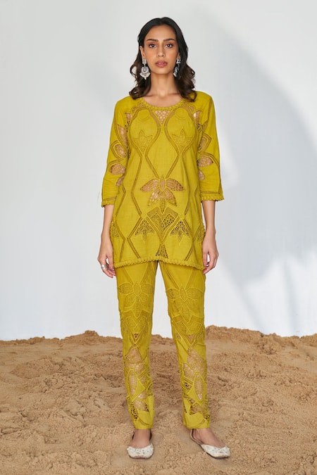 Yellow Cotton Embroidery Round Neck Ava Jaal Schiffli Top With Pant