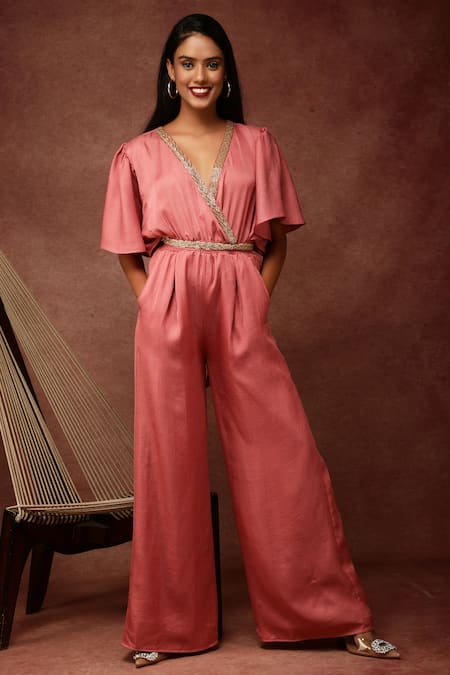Pink Semi Silk Satin V Neck Neckline Embroidered Jumpsuit