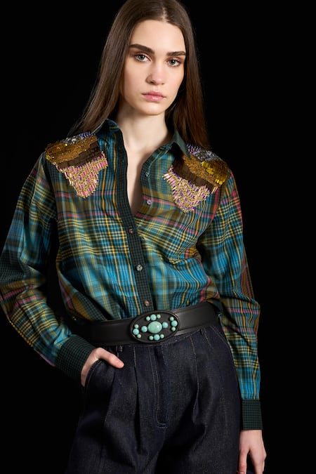 Multi Color Cotton Print Checks Collar Indus Checkered Yoke Shirt
