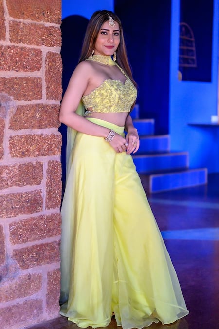 Yellow Organza, Net, Georgette Embroidered One Shoulder Blouse Palazzo Set