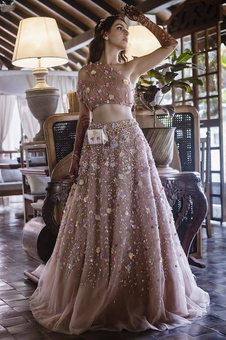 Beige Tulle, Georgette Bead Work, Floral Applique One Shoulder Choli Lehenga Set