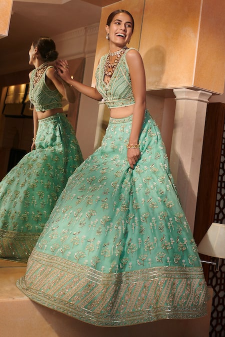 Blue Silk Organza V Neck Aakash Bridal Lehenga Set