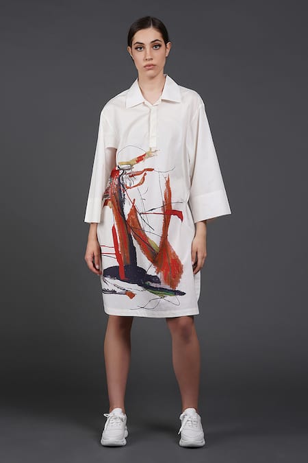 White Cotton Collared Abstract Print Shirt Dress
