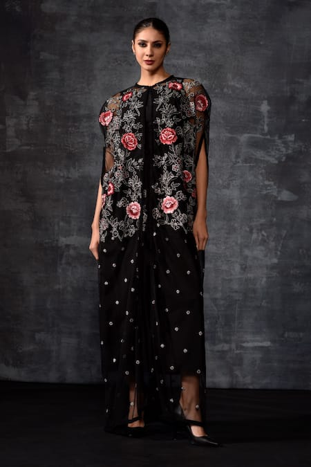 Black Net, Cotton Embroidery Round Neck Floral Kaftan