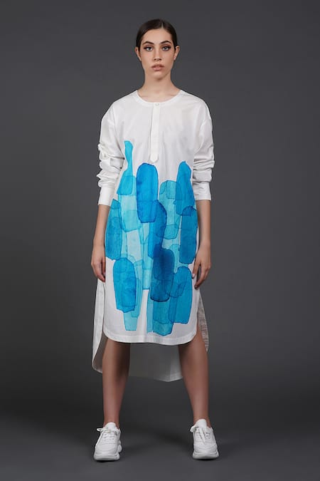 White Cotton Crew Neck Calm Blue Rock Shirt Dress