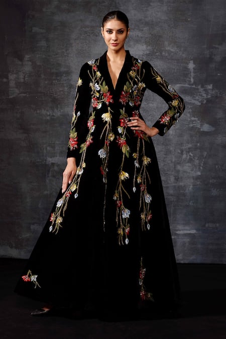 Black Velvet Embroidery, Zari V-neck, Collared Floral Jacket Gown