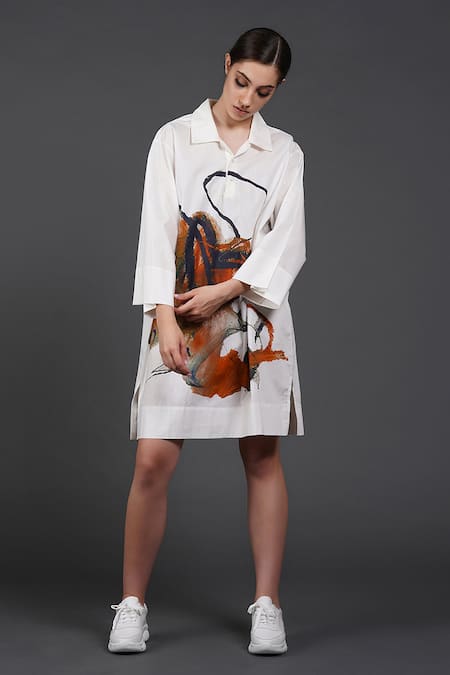 White Cotton Collared Intricate Ink Shirt Dress