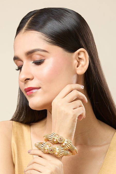 Gold Plated Zari Sphere Floral Carved 2 Pcs Bangles