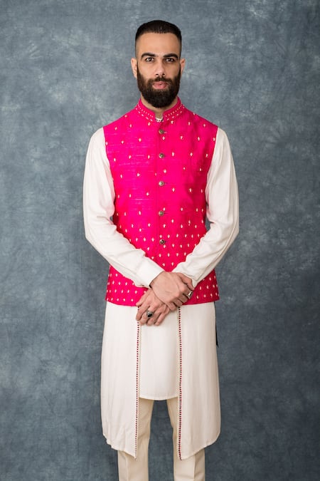 Sarab Khanijou White Raw Silk Embroidered Bundi And Draped Kurta Set