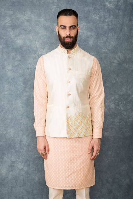 White Raw Silk Embroidered Bundi And Kurta Set