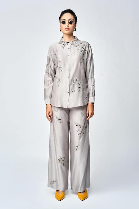 Grey Silk, Chanderi Beads, Embroidery Leaves Asymmetric Shirt With Pant
