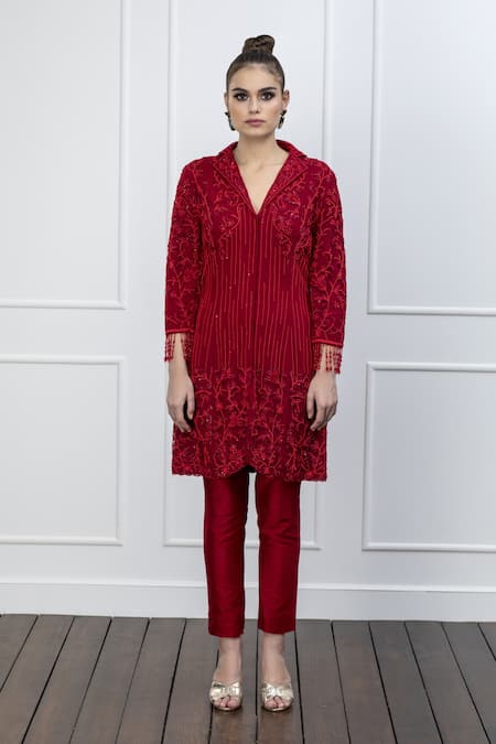 Red Net, Dupion Silk Thread And Beads Notched Collar Embroidered Jacket & Pant Set