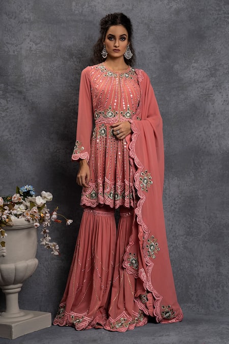 Pink Georgette Dori Work, Mirror, Thread Hand Embellished Kurta And Gharara Set