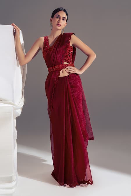 Maroon Organza, Suede Floral Square Neck Scallop Saree With Blouse